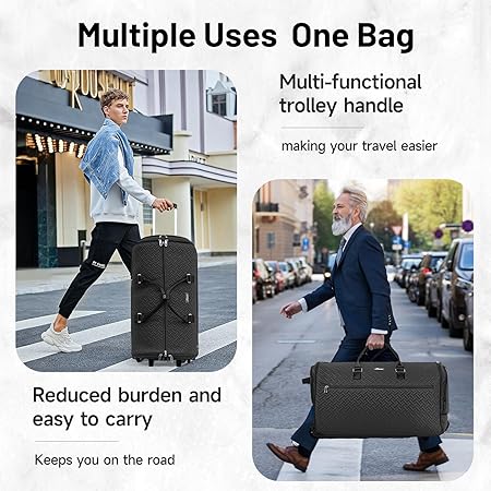 • 🚀 Effortless Movement–Navigate busy airports and train stations with ease thanks to our wheeled travel garment bag. Featuring smooth-rolling wheels and a telescoping handle, you can glide through crowds effortlessly. Keep your hands free for essentials or enjoy a hassle-free journey with travel companions. Say goodbye to the struggles of transporting luggage and embrace the convenience of seamless travel!